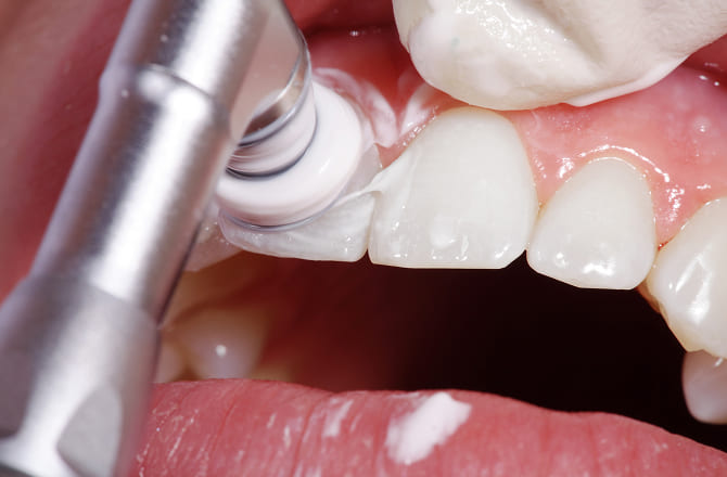 歯面研磨装置を用いて、歯ブラシでは落とせないプラークやバイオフィルムを除去します。ツルツルの状態に仕上げることで、汚れの再付着も防げます。処置後は口の中が爽快に感じられ、見た目もきれいになり、予防効果と同時に清潔感も得られる処置です。