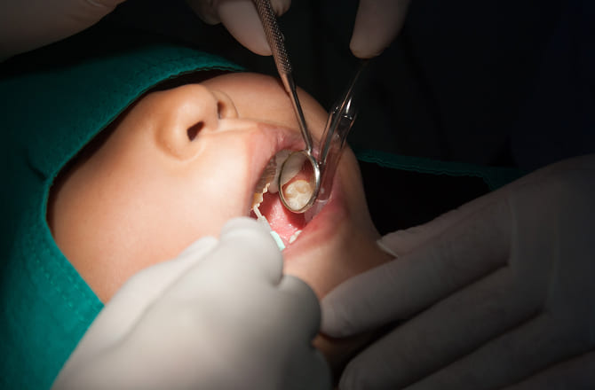 奥歯の噛む面にある細かな溝は、食べかすや汚れが溜まりやすく、虫歯になりやすい部位です。シーラントはその溝をレジンで埋め、汚れが入り込むのを防ぐ処置です。痛みや削る必要はほとんどなく、特に生えたての永久歯を守る方法として効果的です。